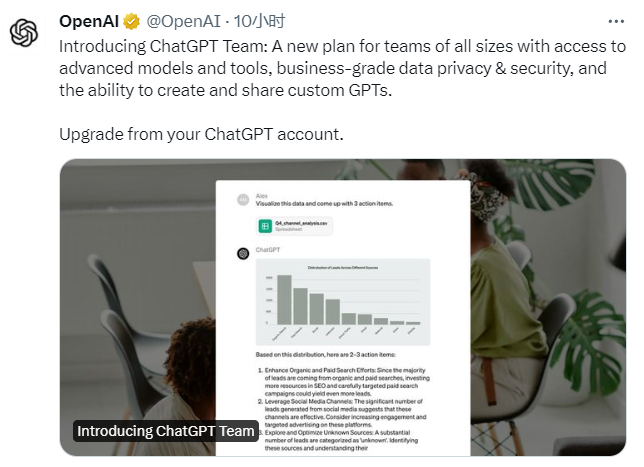 与此同时,OpenAI还为团队规模较小的企业用户推出了新的付费套餐“ChatGPT Team”:套餐内每位用户按年计费时,为每月25美元;按月计费则为每月30美元。与Enterprise用户一样,Team的套餐也配备数据隐私保护功能。
